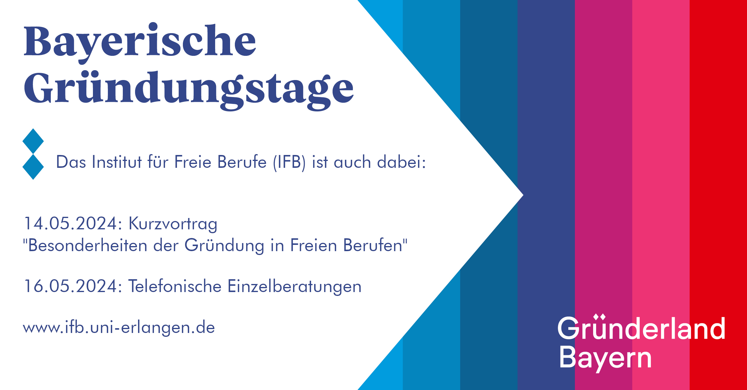 Im Rahmen der Gründungstage Bayern bietet das IFB einen Kurzvortrag zu den Besonderheiten der Gründung in Freien Berufen mit einer anschließenden offenen Sprechstunde an.