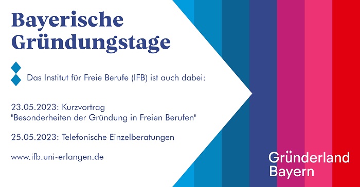 Im Rahmen der Gründungstage Bayern bietet das IFB einen Kurzvortrag zu den Besonderheiten der Gründung in Freien Berufen mit einer anschließenden offenen Sprechstunde an.
